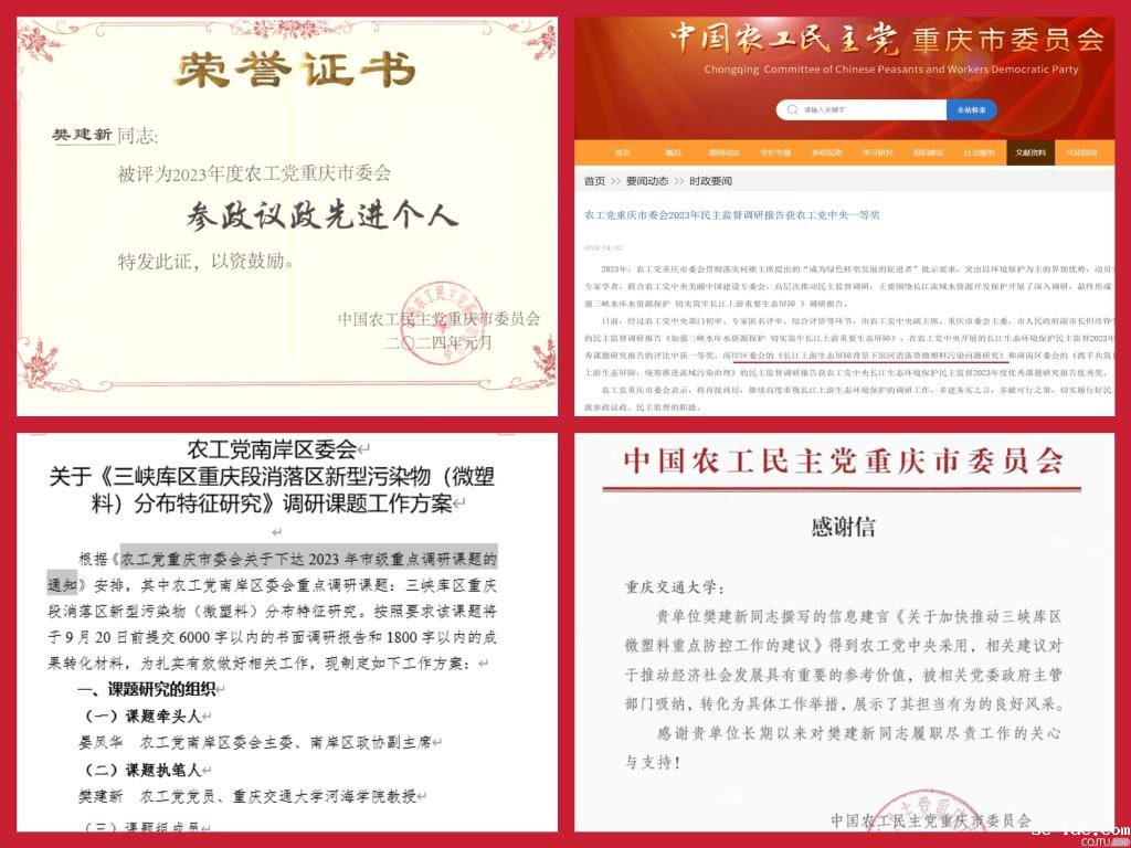 樊建新老师是河海学院校级课程思政示范课程《环境土壤学》、重庆市研究生案例库建设课程《土壤与地下水污染修复》等的主讲教师,近年累计指导硕士研究生16名,主持国家自然科学基金2项、省部级项目8项。樊老师不仅在教学科研育人等工作中表现突出,同时切实履行身为中国农工民主党党员的职责和使命,参政议政意识强烈,为农工党的建设积极贡献智慧和才干。2022年,被评为南岸区优秀农工党员。2023年,被评为农工党重庆市委参政议政先进个人,获农工党中央长江生态环境保护民主监督2023年度优秀课题研究报告优秀奖。今年上半年,其撰写的信息建言《关于加快推动三峡库区微塑料重点防控工作的建议》被农工党中央采用,受到农工党重庆市委员会的大力感谢。