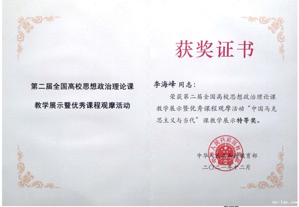 2019年1月,李海峰调入老伟德网上娱乐马克思主义学院。五年多来,他一直主讲本科生“马克思主义基本原理”、硕士生“思想政治教育学专题研究”、博士生“中国马克思主义与当代”等课程,对事业高度负责,用自己对教学的热爱和对学生的关爱潜移默化影响和改变着学生。2021年12月,李海峰在第二届全国高校思政课教学展示暨优秀课程观摩活动中荣获“特等奖”。