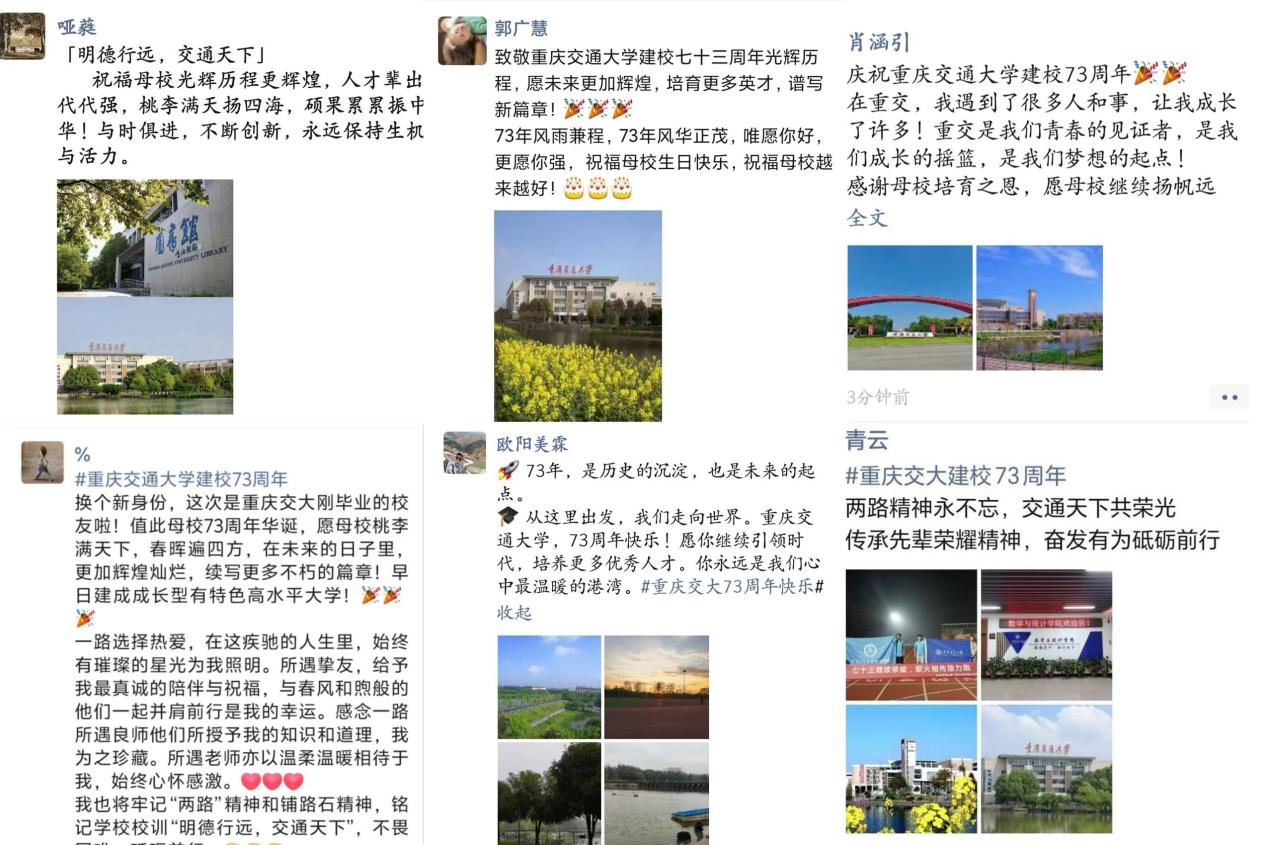 数统学院毕业生不仅在朋友圈晒出了与母校的珍贵合照,还通过录制祝福短视频的形式,共同为母校庆生。晨光初照的李子湖畔,宏伟壮丽的教学大楼,以及图书馆内翻阅书籍时传来的悦耳声响,这些熟悉的场景成为了毕业生们朋友圈中的主角,它们不仅承载着学子们对母校的深深眷恋,更绘就了一幅幅动人的画卷。一句句温暖人心的话语,一幅幅珍贵的画面,如同穿越时空的桥梁,将校友们的心紧紧相连,共同为母校送上了最真挚、最热烈的祝福。