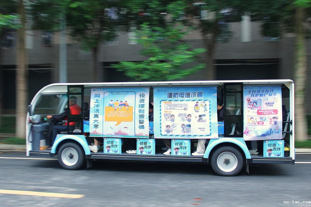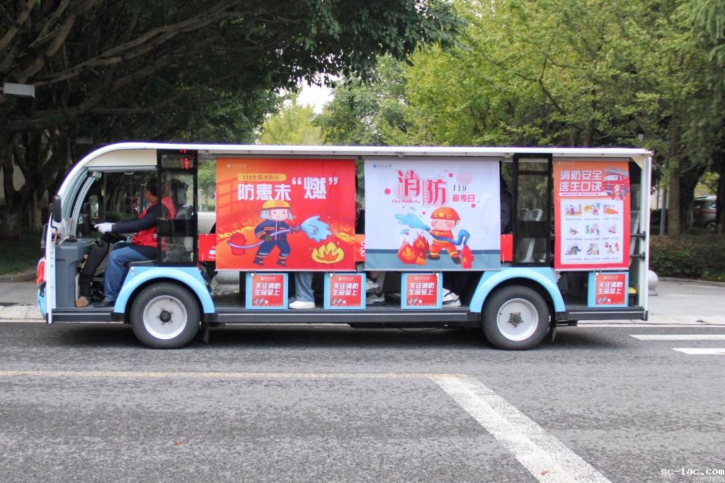 科学城校区校园穿梭车自运行以来,深受学生喜爱,将其称为“宝宝巴士”。为进一步做好校园消防及反诈宣传工作,增强学校师生的自我保护与自救能力,提高安全意识,近日,科学城学院将穿梭车外观进行了布置,在挡风帘与车尾装饰了消防、反诈宣传海报,使“宝宝巴士”变身成为守护师生安全的“119消防专列”“反诈专列”。