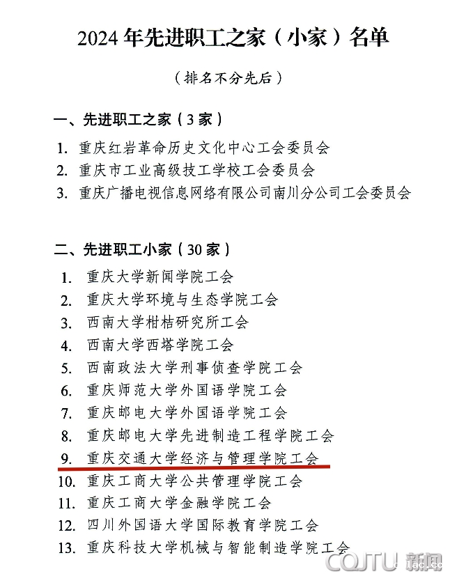 临近年末,喜报频传。近日,我校经管学院分工会获授重庆市教科文卫体工会2024年“先进职工小家”荣誉称号。
