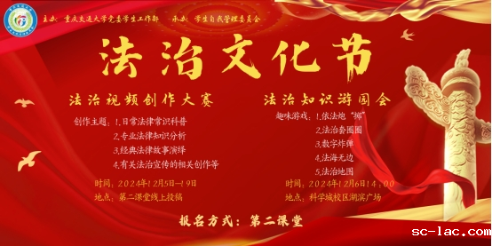 2024年12月4日是我国第十一个国家宪法日,为培养同学们学法、守法、尊法的法律意识,有力推动学生学思践悟行相统一,我校特举办2024年法治文化节系列活动,本次活动由校党委学生工作部主办,学生自我管理委员会承办。文化节活动分为三大部分:宪法条例晨读、法治视频创作大赛、法治知识游园会,活动通过线上+线下结合的方式开展,共计2000余人参与。