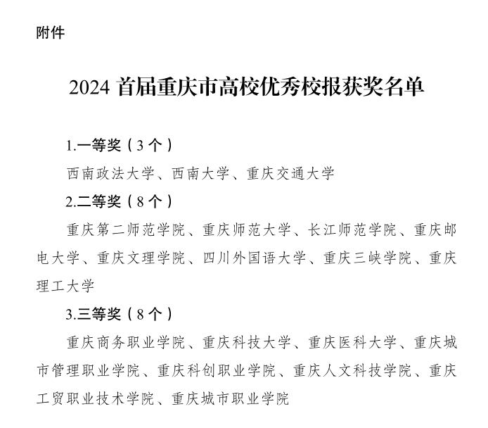 通知指出,为深学笃行习近平文化思想,发挥高校校报在推动教育改革发展和文化育人方面的积极作用,中共重庆市委教育工委委托重庆市教育新闻研究会组织开展了2024首届重庆市高校优秀校报评审工作。经过专家组认真评审,最终评选出2024首届重庆市高校优秀校报获奖单位19个,其中,一等奖3个、二等奖8个、三等奖8个。