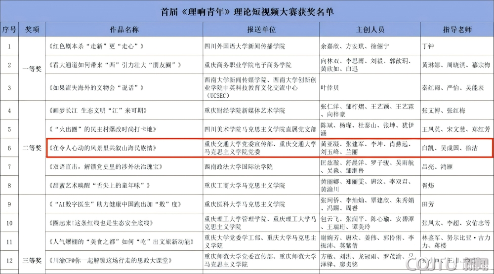 近日,由重庆市委网信办、重庆市教育委员会、重庆日报联合主办,四川美术学院和重庆日报理论视频栏目《理响青年》共同承办的首届《理响青年》理论短视频大赛评选结果公布,由校党委宣传部、马克思主义学院党委创制的短视频《在令人心动的风景里共叙山海民族情》荣获大赛二等奖。