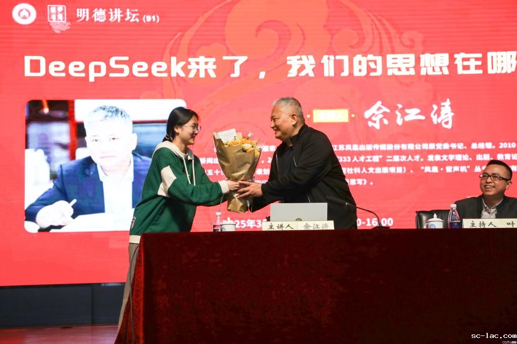 “当数字洪流席卷全球,人工智能正以其强大功能深刻影响着人类社会发展进程,带来了新一轮的心智化机遇与挑战。”讲坛中,佘江涛以近几年创作、出版经历为出发点,指出新时代背景下的人工智能算力和算法强大、加速度快、结构化能力强等优势,耗能巨大、逻辑化程度低、正确性低等劣势,提醒同学们需要辩证看待人工智能的优势与劣势,强调了个体认知提升的重要性。