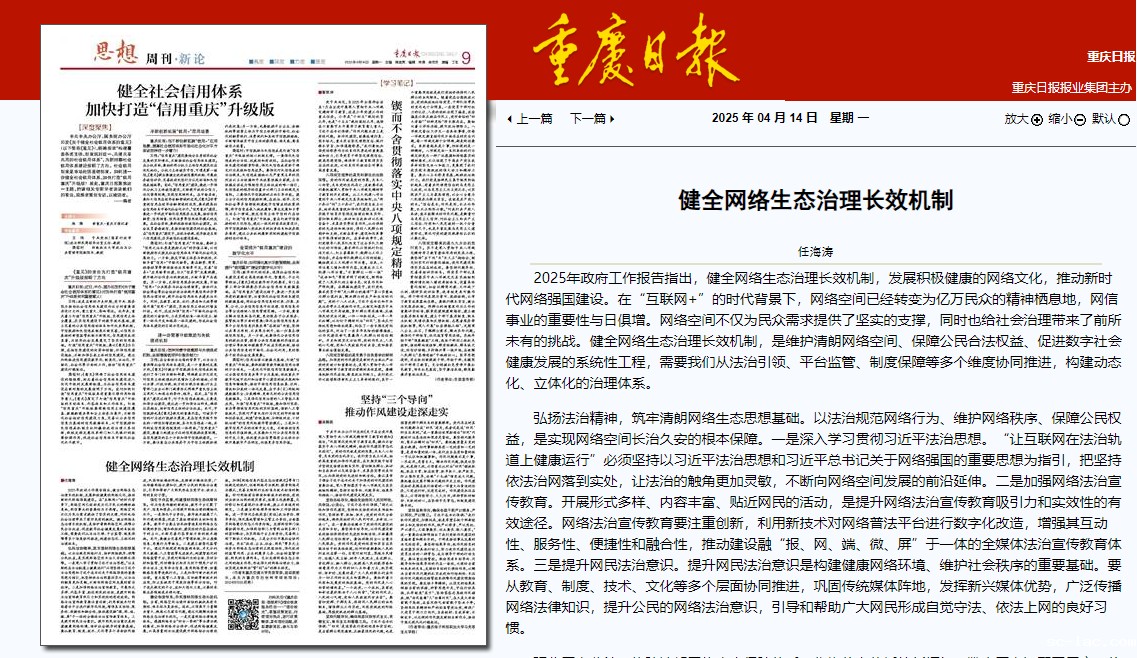 2025年政府工作报告指出,健全网络生态治理长效机制,发展积极健康的网络文化,推动新时代网络强国建设。在“互联网+”的时代背景下,网络空间已经转变为亿万民众的精神栖息地,网信事业的重要性与日俱增。网络空间不仅为民众需求提供了坚实的支撑,同时也给社会治理带来了前所未有的挑战。健全网络生态治理长效机制,是维护清朗网络空间、保障公民合法权益、促进数字社会健康发展的系统性工程,需要我们从法治引领、平台监管、制度保障等多个维度协同推进,构建动态化、立体化的治理体系。