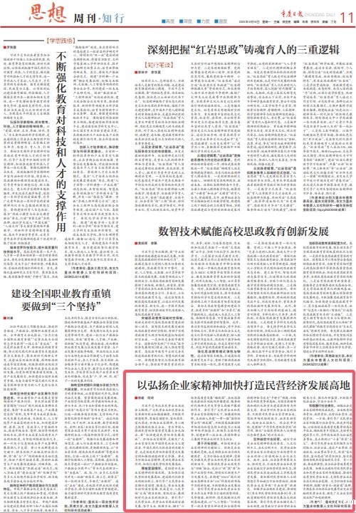 习近平总书记在民营企业座谈会上强调,广大民营企业和民营企业家要满怀创业和报国激情,不断提升理想境界,厚植家国情怀,富而思源、富而思进,弘扬企业家精神,专心致志做强做优做大企业。重庆市深入推动民营经济高质量发展大会也指出,要“加快建设民营经济发展高地”。弘扬企业家精神,是激发广大企业家坚定做中国特色社会主义建设者、中国式现代化促进者的关键力量,也是促进民营经济获得更大发展空间和强劲动能的重大举措。要大力弘扬企业家精神,更好发挥企业家作用,加快打造民营经济发展高地。