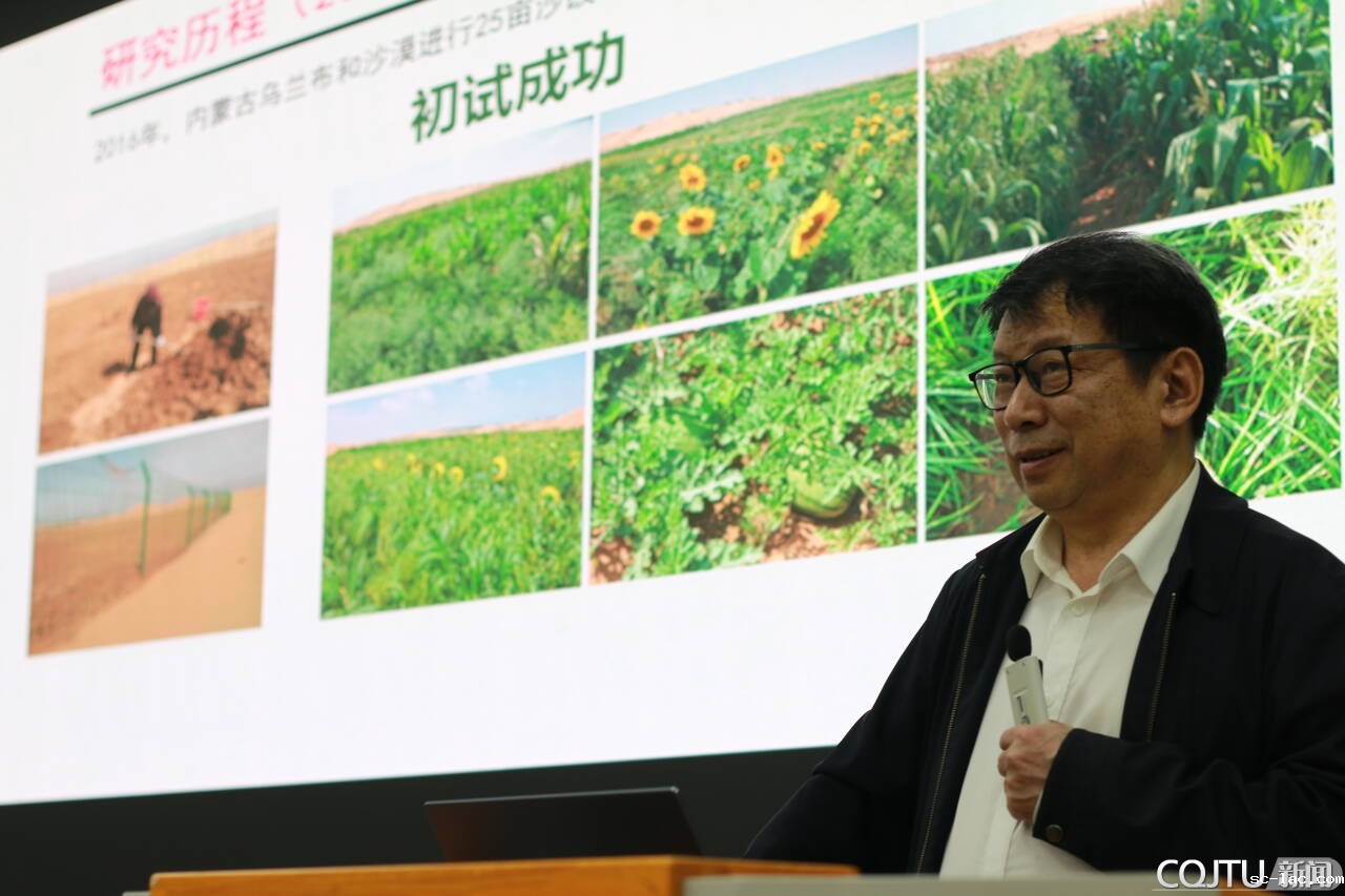 大屏幕中,乌兰布和沙漠的今昔对比视频引发惊叹:十年前飞沙蔽日的沙海,如今竟翻滚着金黄的硕果。当镜头定格在沙漠试验田的西瓜藤蔓时,全场响起热烈掌声。“这不是魔法,而是力学约束创造的生态奇迹。”易志坚教授以“沙粒力学特性”研究为切入点娓娓道来,从见证奇迹-当力学遇见沙漠、敢于跨界-大地在召唤、十七年磨一剑-将论文写在祖国大地上、更多惊喜-深扎根基万木葱、研究真问题-让科学原理和事实说话、未来可期-为沙漠化治理提供中国方案等方面深入浅出地讲述“沙漠土壤化”技术的科学原理、科研成果以及科创育人的故事。“沙粒在特定约束条件下形成稳定的‘万向结合作用力’是我们的重要发现,这也是‘沙变土’的力学基础。”易教授用通俗易懂的语言揭开了这项“黑科技”的神秘面纱。