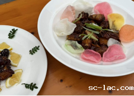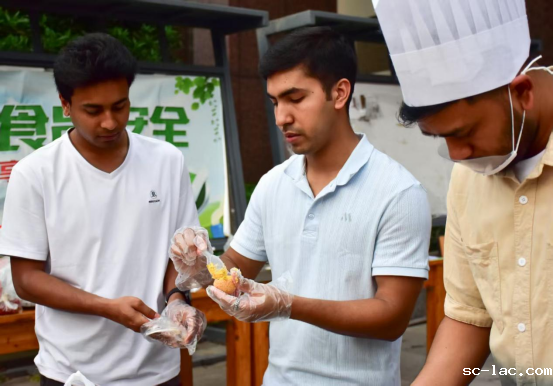 比赛过程中,各队既展现了扎实的烹饪功底,又体现了对家乡饮食文化的深刻理解。赛场上,作为第二组队伍之一的国际教育学院的留学生们正在制作家乡美食。他们一边制作着异国风味的菜肴,一边用流利的中文向身旁的观众解释菜品的特点。