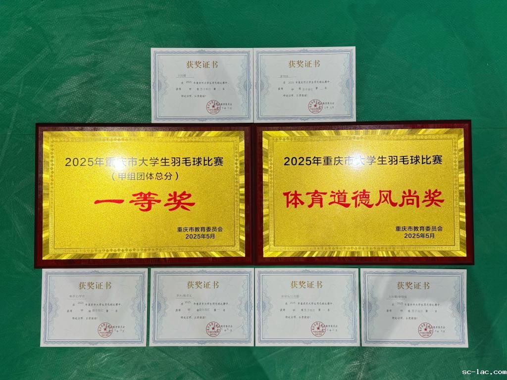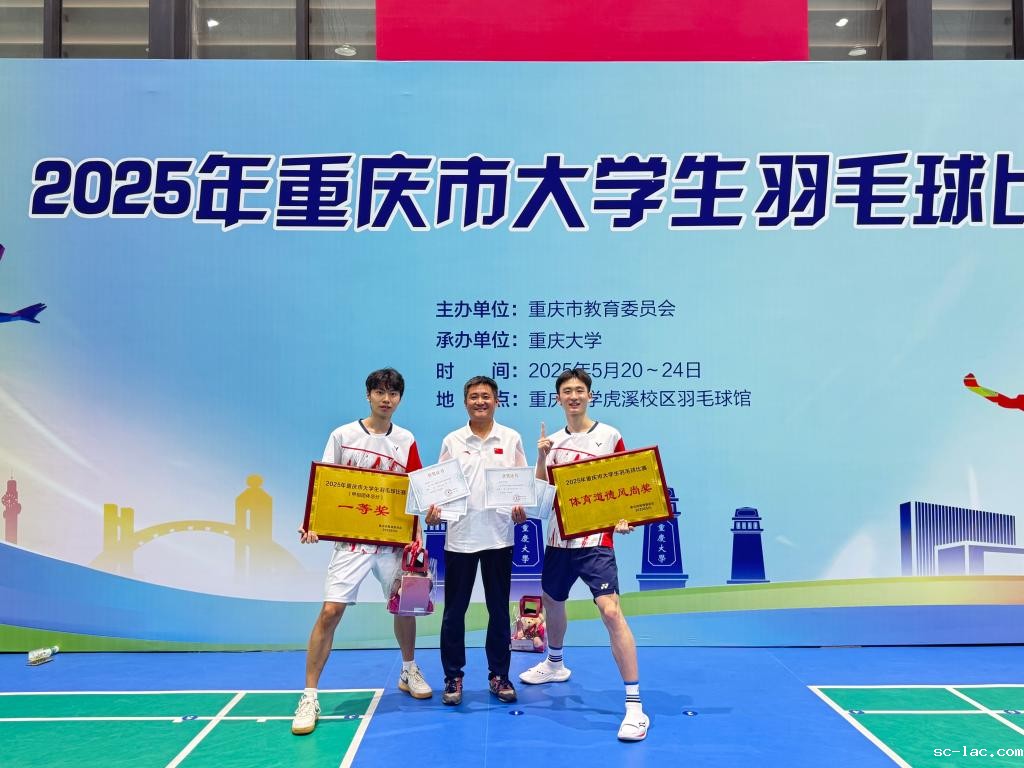 5月20日-24日,由重庆市教育委员会主办、重庆大学承办的2025年重庆市大学生羽毛球比赛在重庆大学虎溪校区羽毛球馆举行。经过激烈争夺,我校羽毛球队喜获甲组团体冠军、包揽男单冠亚军、混双卫冕冠军,收获男双冠军,创造历史最佳战绩。