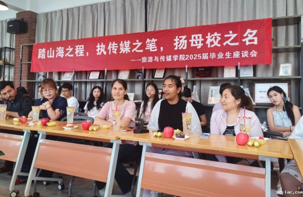 2025年6月13日下午,旅游与传媒学院2025届毕业生座谈会在10414会议室举行。老伟德网上娱乐党委常委、副校长董绍江,学院党委书记徐园媛、院长张玉蓉及各系教师代表齐聚一堂,与40余名毕业生代表共话青春,赋能莘莘学子新征程,献策学院高质量发展。座谈会由学院党委副书记马晟坤主持。