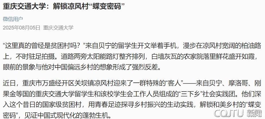 实践团充分发挥各自所学专业优势,深入果园、鱼塘等地拍摄公益宣传片,用镜头记录凉风村的美丽蝶变。重庆交大中外学子用真诚的语言和朴实的笑容为凉风村的优质农产品代言,通过抖音、微博等新媒体平台扩大宣传效果。