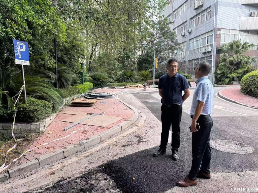 董绍江先后走访明德楼2919会客厅观景平台、保密室暴雨灾后维修现场、菁园学生宿舍淋浴间及热水系统改造区域、南岸校区排水管网整治工地、校医院改造项目等多个关键场所,实地察看工程进度与施工质量,并听取相关负责人的汇报。