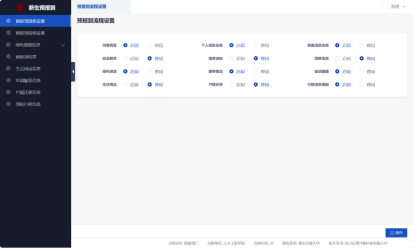 一是预报到流程动态管理。首创流程节点弹性管理模式,针对个人信息完善、家庭信息填报、安全教育、宿舍选择等12项预报到流程,可根据新生需求与学校安排,动态启用或停用各环节。该模式既保障了核心环节不遗漏,又避免了新生重复操作。