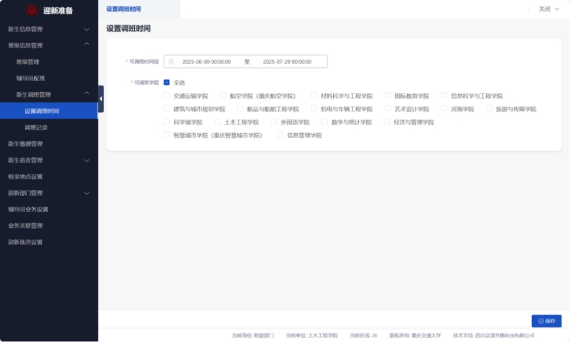 三是班级与辅导员统一管理。搭建全校统一的班级与辅导员管理体系,支持新生班级的新增、编辑与自动分班。通过辅导员配班功能实现全校辅导员与班级的精准匹配,并设立调班时间窗口,保障学院在规定时段内灵活调整新生班级配置,为后续迎新工作的精准服务奠定坚实基础。