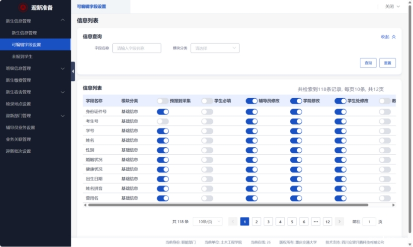 二是数据字段精细化管理。创新设置可编辑字段精细化配置功能,对百余项新生数据字段分别明确采集与编辑权限,如预报到采集、学生必填、辅导员修改等,在精准采集数据的同时,有效兼顾了不同层级的管理需求。
