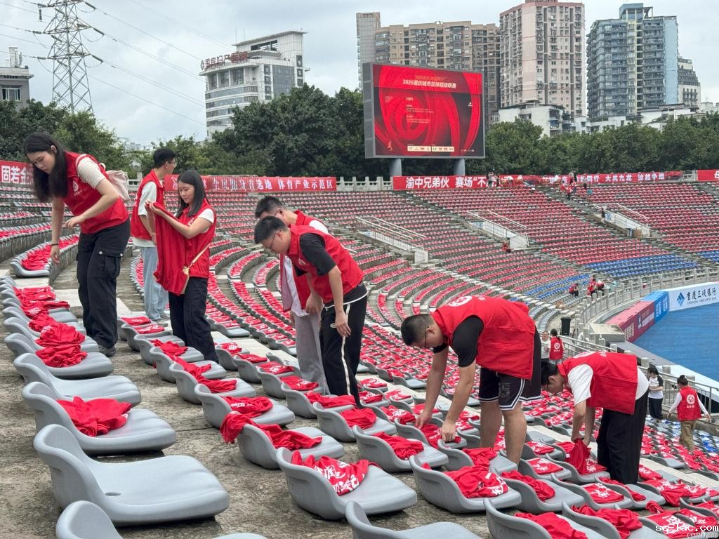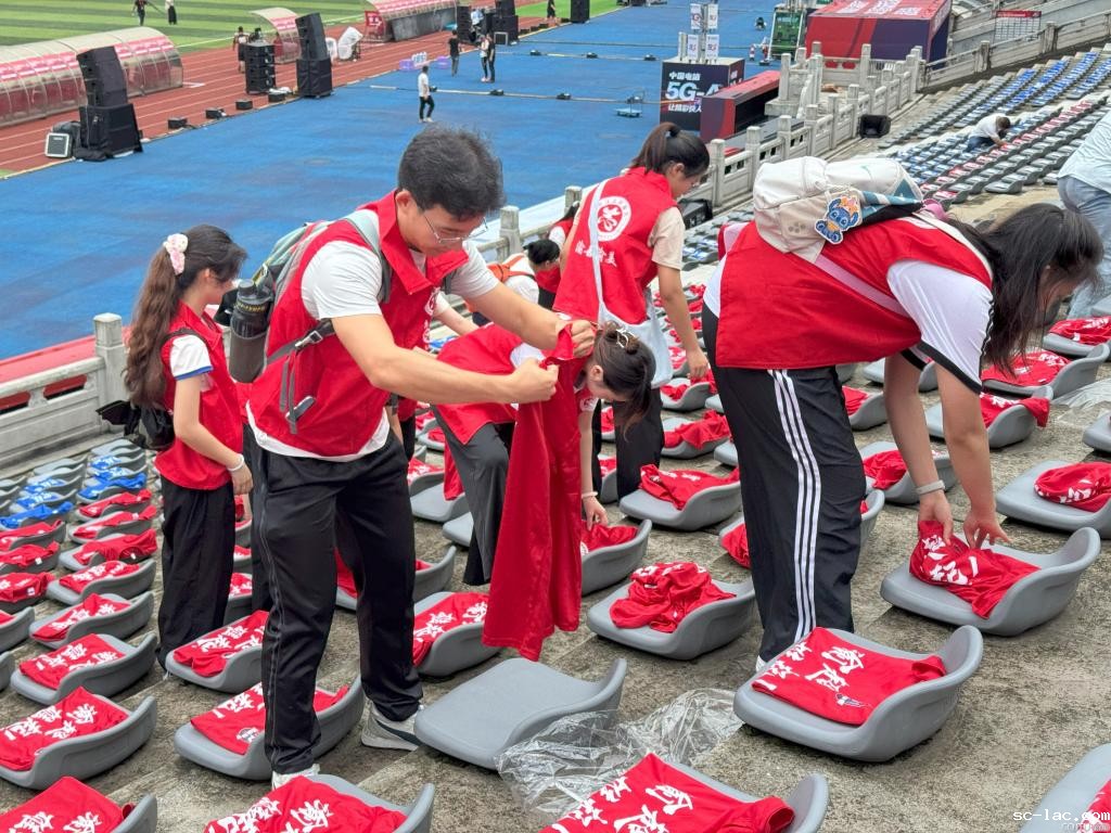 培训结束后,志愿者们迅速投入到场内布置工作中。他们分工协作、默契配合,将一份份纪念球衣和纪念球票整齐摆放在观众席的每一个座位上,以细致入微的工作态度为开幕式的顺利进行提供了有力保障。