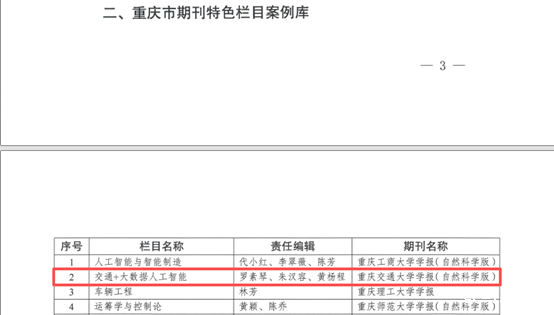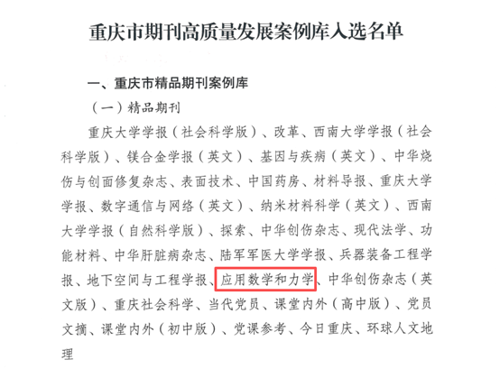 近日,重庆市新闻出版局公布了重庆市期刊高质量发展案例库名单,《应用数学和力学》入选重庆市精品期刊案例库“精品期刊”,《老伟德网上娱乐学报(自然科学版)》的“交通+大数据人工智能”栏目和《老伟德网上娱乐学报(社会科学版)》的“‘两路’精神研究”入选重庆市期刊特色栏目案例库,5篇优质文章入选重庆市期刊优秀文章案例库。