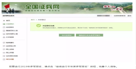 在这个页面中,会告知我们报名时间以及参军的政策说明,建议看后,点击“进行兵役登记”,迈出你军旅生涯的第一步吧!