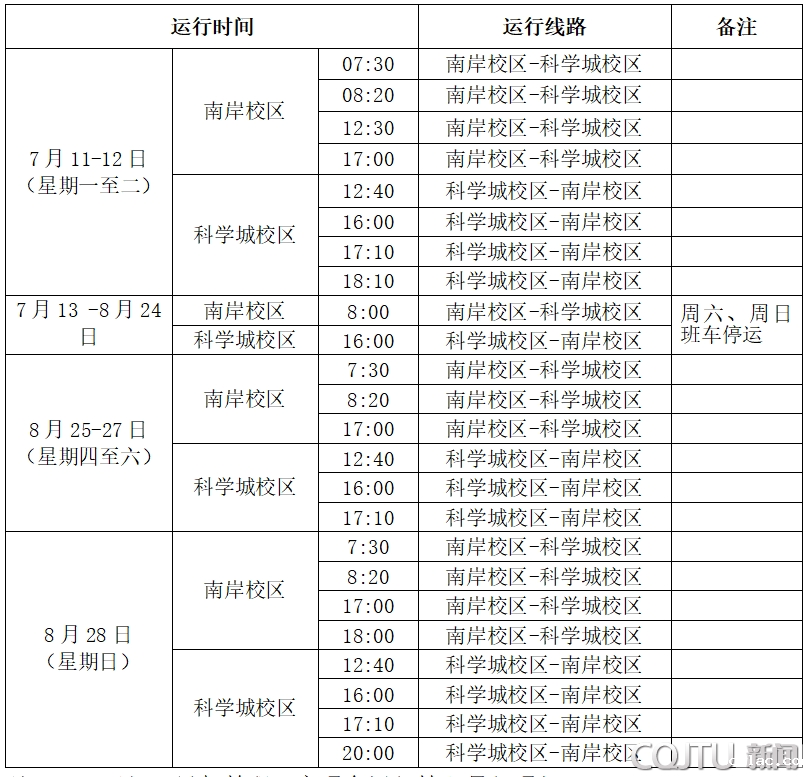 根据学校工作安排,2022年7月11日至8月28日南岸校区⇋科学城校区教职工交通车运行时间和线路安排如下: