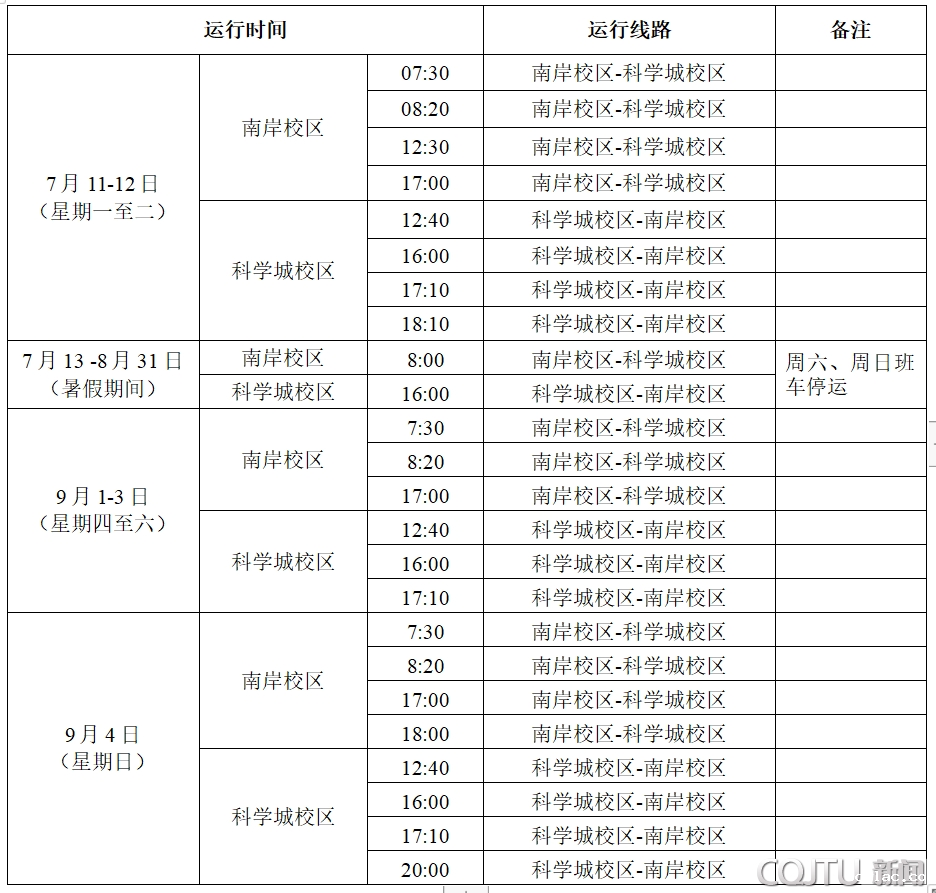 注:1.9月5日起教职工交通车运行情况另行通知。