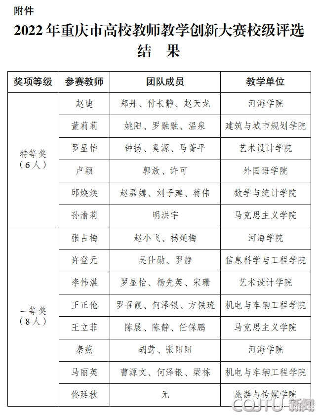 根据《重庆市教育委员会关于举办2022年重庆市高校教师教学创新大赛的通知》精神,学校组织开展了大赛校级评选工作。经个人积极申报,单位认真推荐,评委客观公正评审,共评选出特等奖6名、一等奖8名。现将获奖结果予以通报(详见附件)。