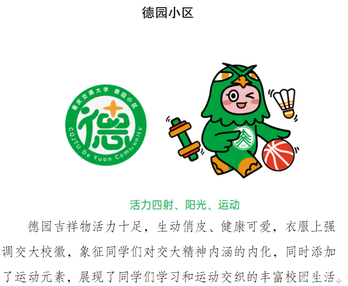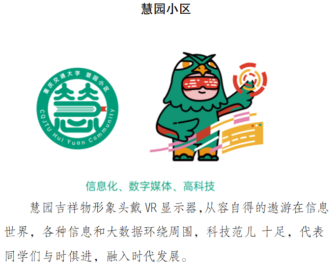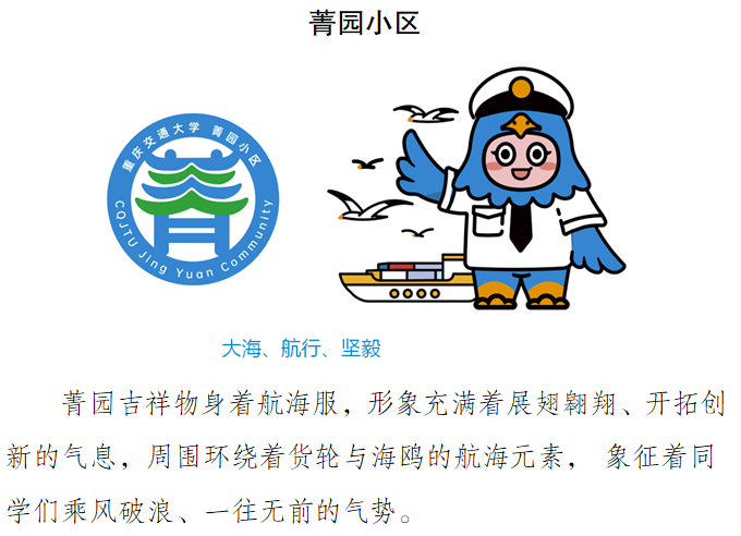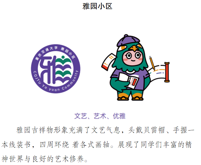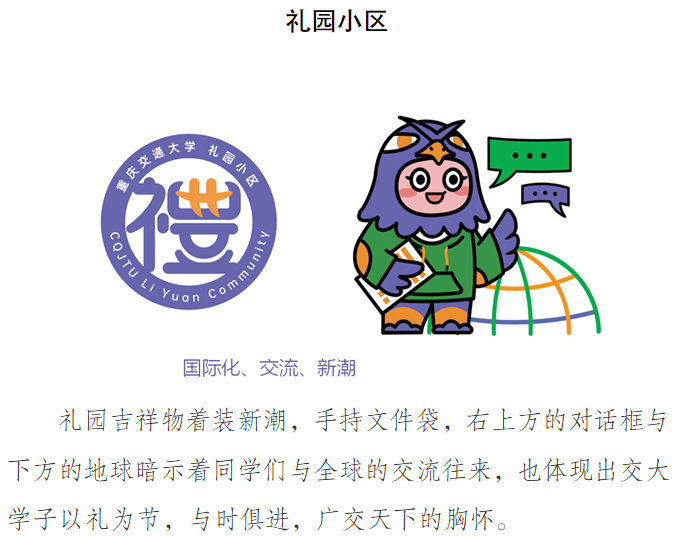 全校六个学生社区(菁园小区、雅园小区、慧园小区、知园小区、德园小区、礼园小区)的吉祥物命名。