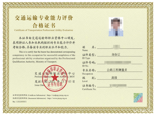 公路工程测量员(以下简称“测量员”)专业能力评价由交通运输部职业资格中心负责评价并颁发《交通运输专业能力评价合格证书》,学员必须经过由交通运输部职业资格中心授权的项目实施机构进行考试,并且考试合格后,方可获得此证书。“测量员”证书加盖“交通运输部职业资格中心”印章,实行全国统一编号,可在交通运输部的交通职业资格网(www.jtzyzg.org.cn)上查询,且全国通用。该证书持证者可在全国公路工程建设、管理和养护过程中从事测量工作。
