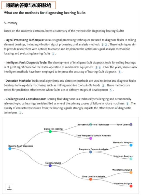 Scopus AI会生成一段带有论文索引的介绍和相应问题的思维导图,帮助我们了解这一研究问题的发展现状。