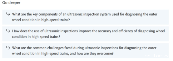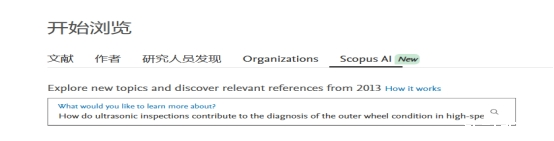 Scopus AI可以用来查询你想知道的任何科学名词和科学问题。比如想了解“超声波检查如何有助于高速列车外轮状况的诊断?”,就可以在Scopus AI对话框直接提问:“How do ultrasonic inspections contribute to the diagnosis of the outer wheel condition in high-speed trains?”