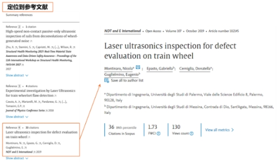 Scopus AI区别于ChatGPT,生成内容有真实可靠的应用文献作为支撑,每一句描述都会标记文献来源,避免了Chat GPT生成深度赝品的问题。还是上一个问题:“How do ultrasonic inspections contribute to the diagnosis of the outer wheel condition in high-speed trains”,Scopus AI除了生成一段Summary外,还会列出生成该段文字参考的相关引用文献,并且每篇文献都是真实可以被检索到的。