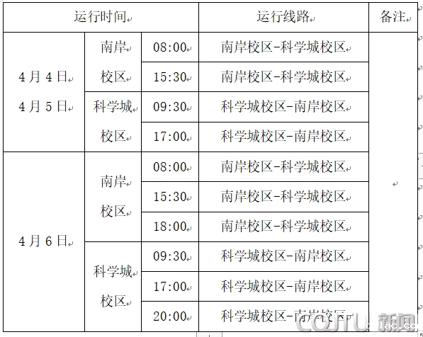 一、4月7日按工作日时刻表运行(当天晚上21:10南岸校区至科学城校区交通车照常运行);
