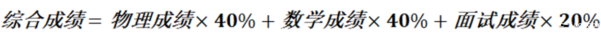 6.综合成绩排序:根据申请学生的物理、数学能力考试成绩和面试成绩,按下式确定综合成绩,并从高到低进行排序。