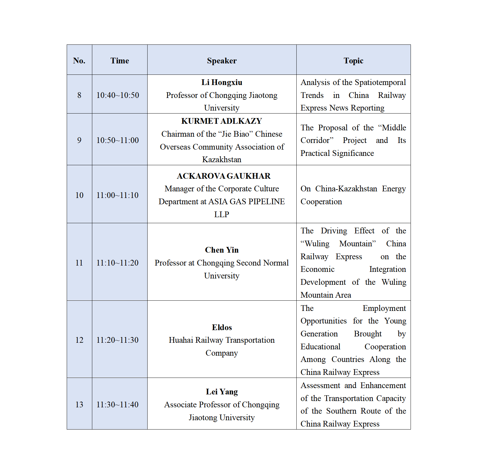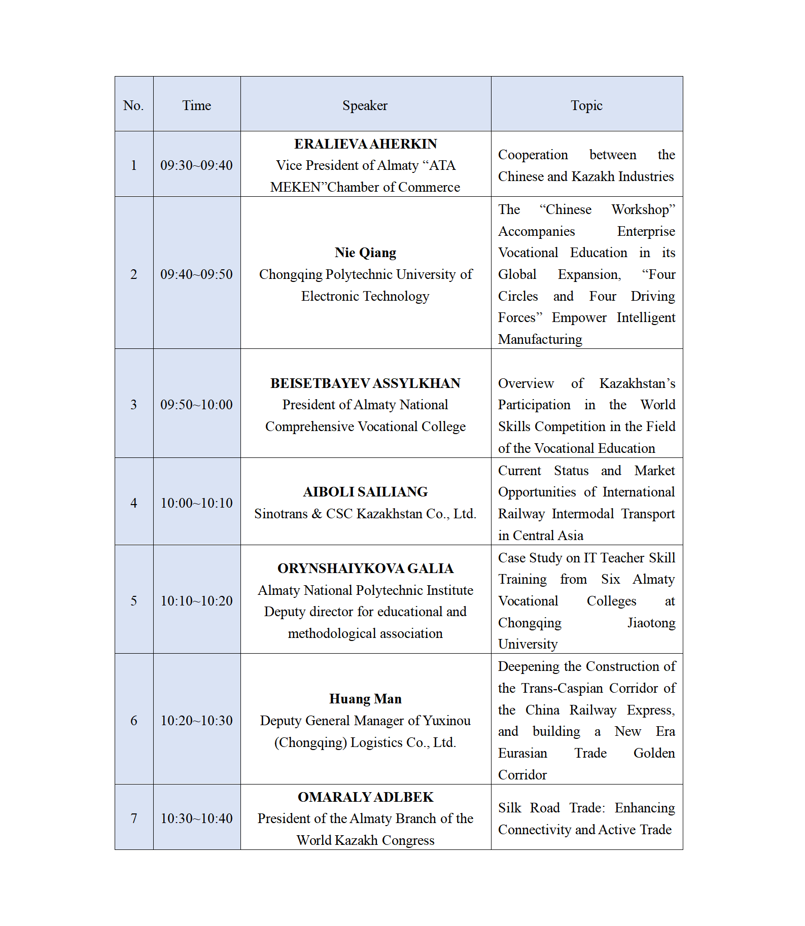 Speakers and Topics (Moderator:Mamyruly Talgat)