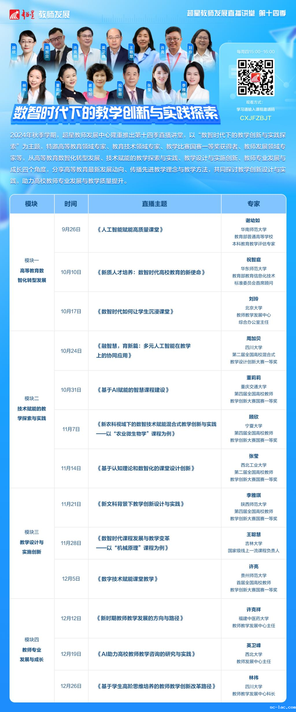 新学期,教师发展中心联合超星集团教师发展服务平台共同推出的“2024年秋教师发展直播讲堂”正式上线啦,以“数智时代下的教学创新与实践探索”为主题,特邀高等教育领域专家、教育技术领域专家、教学比赛国赛一等奖获得者、教师发展领域专家等,从高等教育数智化转型发展、技术赋能的教学探索与实践、教学设计与实施创新、教师专业发展与成长四个角度,分享高等教育最新发展动向、传播先进教学理念与教学方法,共同探讨教学创新设计与实践,助力高校教师专业发展与教学质量提升。