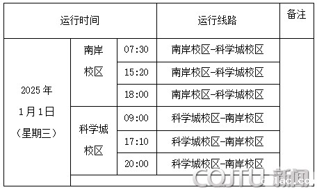 1、2024年12月31日21:10南岸校区到科学城校区班次不开行,2025年1月2日(星期四)起交通车按正常工作日运行时刻表执行;