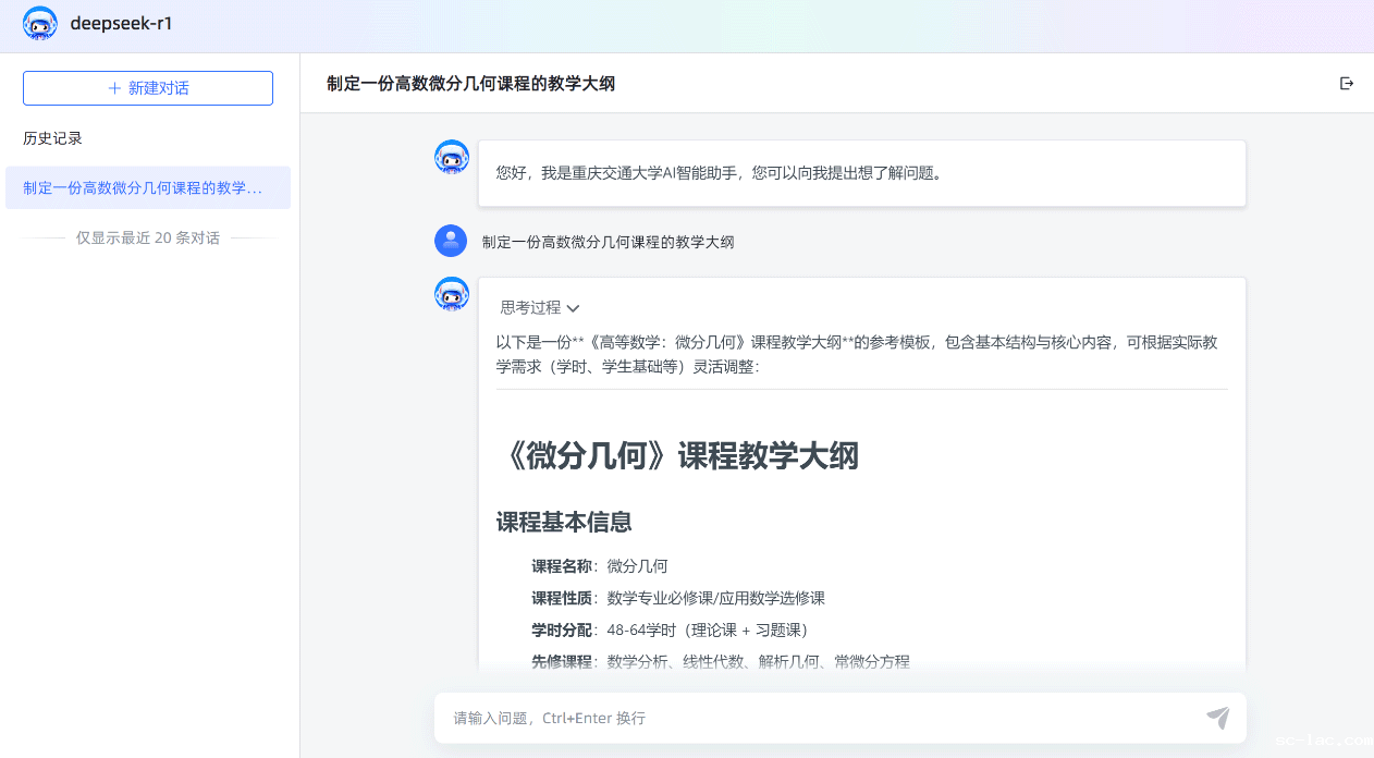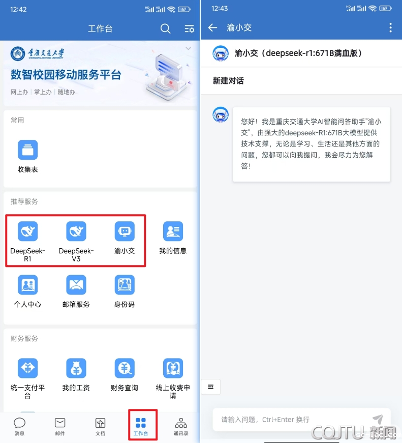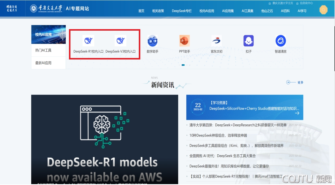 网页版:打开校内AI主题网站https://ai.cqjtu.edu.cn,选择DeepSeek-R1和DeepSeek-V3模型即可开始对话。