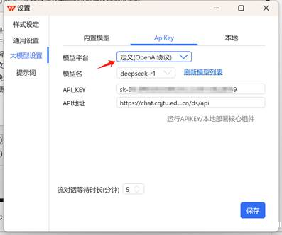 3.模型平台选择定义(OpenAI协议),API_KEY填入从学校平台申请的API KEY,API地址填写:https://chat.cqjtu.edu.cn/ds/api
