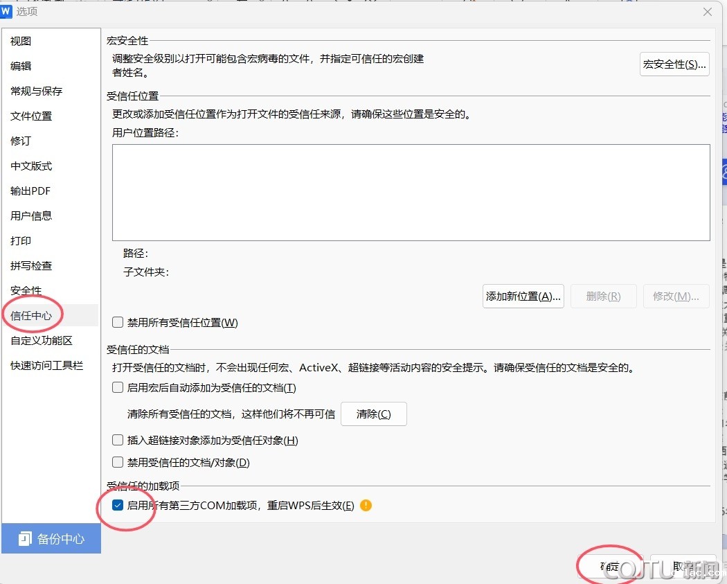 如未显示OfficeAI插件,需在WPS的文件-选项-信任中心-受信任的加载项,勾选“勾选启用第三方COM加载项”,然后重启WPS后打开OfficeAI插件。