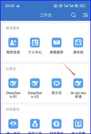 1.在企业微信工作台AI服务板块,打开“ds api key申请”,选择申请模型(或登录https://chat.cqjtu.edu.cn/ds/ui)。