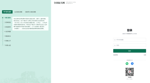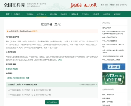 2025年全国征兵网网上登记报名已经开始。我校毕业生可登录全国征兵网进行兵役登记和应征报名,之后根据兵役机关安排进行实地初审初检。现在不妨了解下征兵政策和报名条件吧(例如:报名年龄、身体条件规定等)。