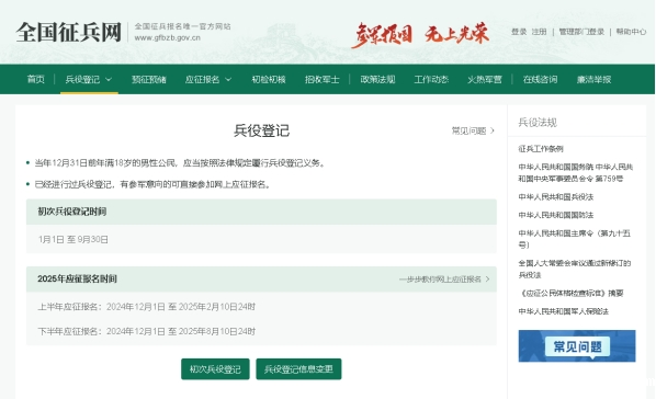 有些小伙伴看到这么多的菜单就有些懵了,其实不用紧张,如果你是第一次来的男生,从“兵役登记”进入页面就可以了,兵役登记时间为每年1月1日至9月30日。