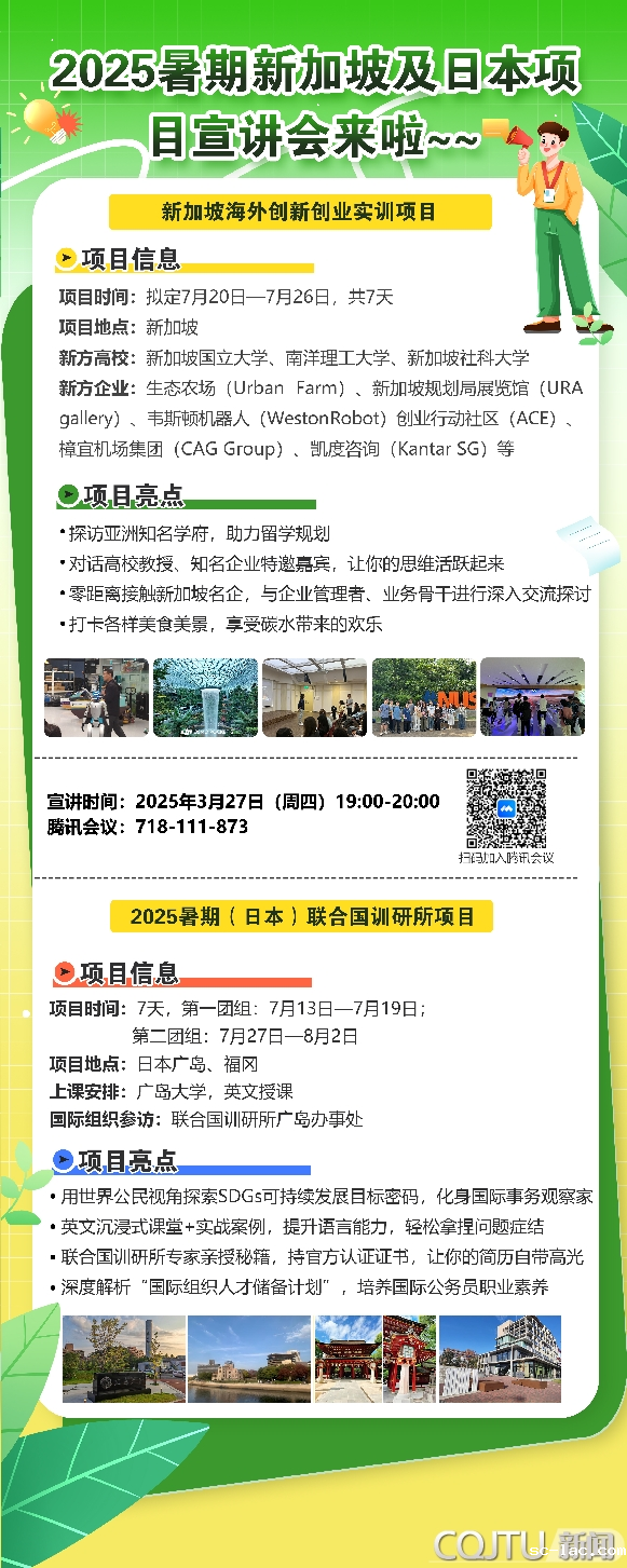 2.2025年暑期新加坡名校海外创新创业实训项目简介:http://oice.cqjtu.edu.cn/info/1028/2083.htm
