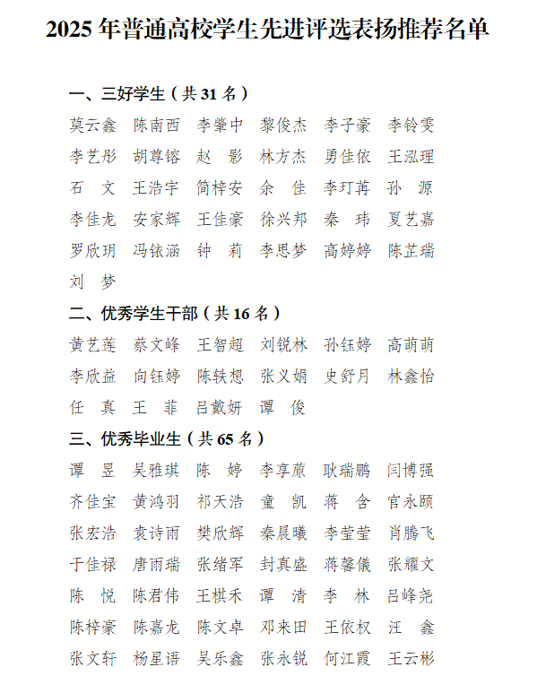 附件:2025年普通高校学生先进评选表扬推荐名单