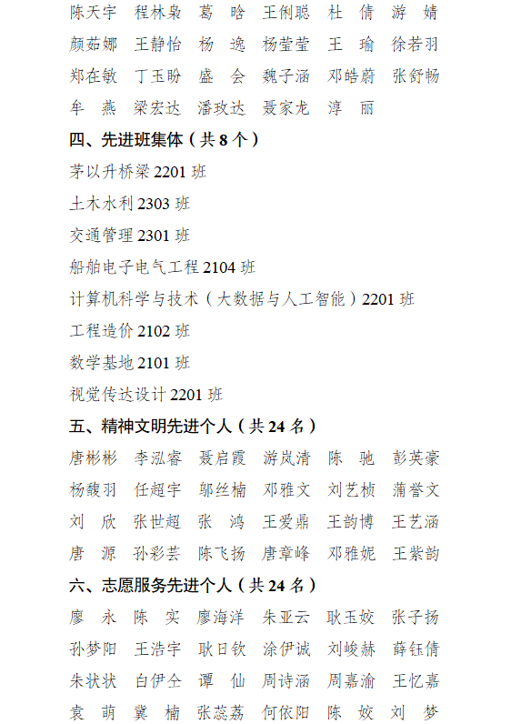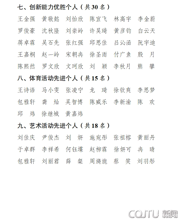 按照《重庆市教育委员会关于开展2025年普通高校学生先进评选表扬活动的通知》精神,学校组织开展了重庆市2025年高校学生先进班集体和先进个人评选工作。经各学院评选推荐,学生工作部(处)、校团委、体育部组织审核,学校2025年第七次校长办公会审定,现将31名市级三好学生、16名市级优秀学生干部、65名市级优秀毕业生、8个市级先进班集体、24名市级精神文明先进个人、24名市级志愿服务先进个人、30名市级创新能力优胜个人、15名市级体育活动先进个人、18名市级艺术活动先进个人名单在全校范围内进行公示,如有异议,请在公示期内与学生工作部(处)、校团委、体育部、纪检监察室联系。
