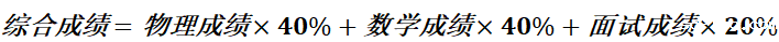6.综合成绩排序:根据申请学生的物理、数学能力考试成绩和面试成绩,按下式确定综合成绩,并从高到低进行排序。