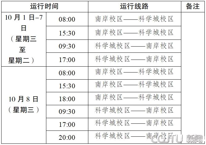 2、10月9日(星期四)起交通车按正常工作日运行(10月10日21:20南岸至科学城班次开行)。