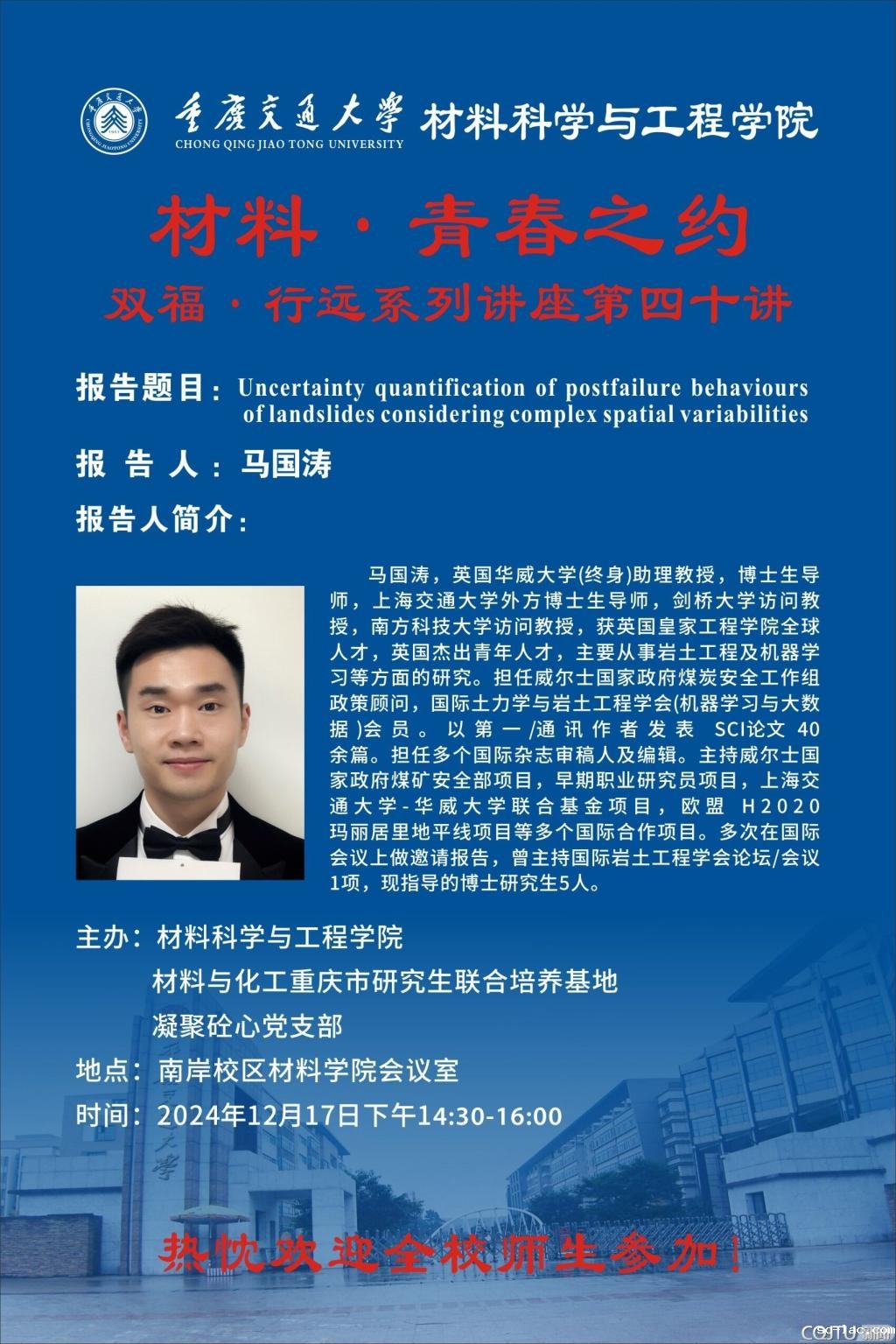 材料·青春之约系列讲座:Uncertainty quantification of postfailure behaviours of landslides considering complex spatial variabilities