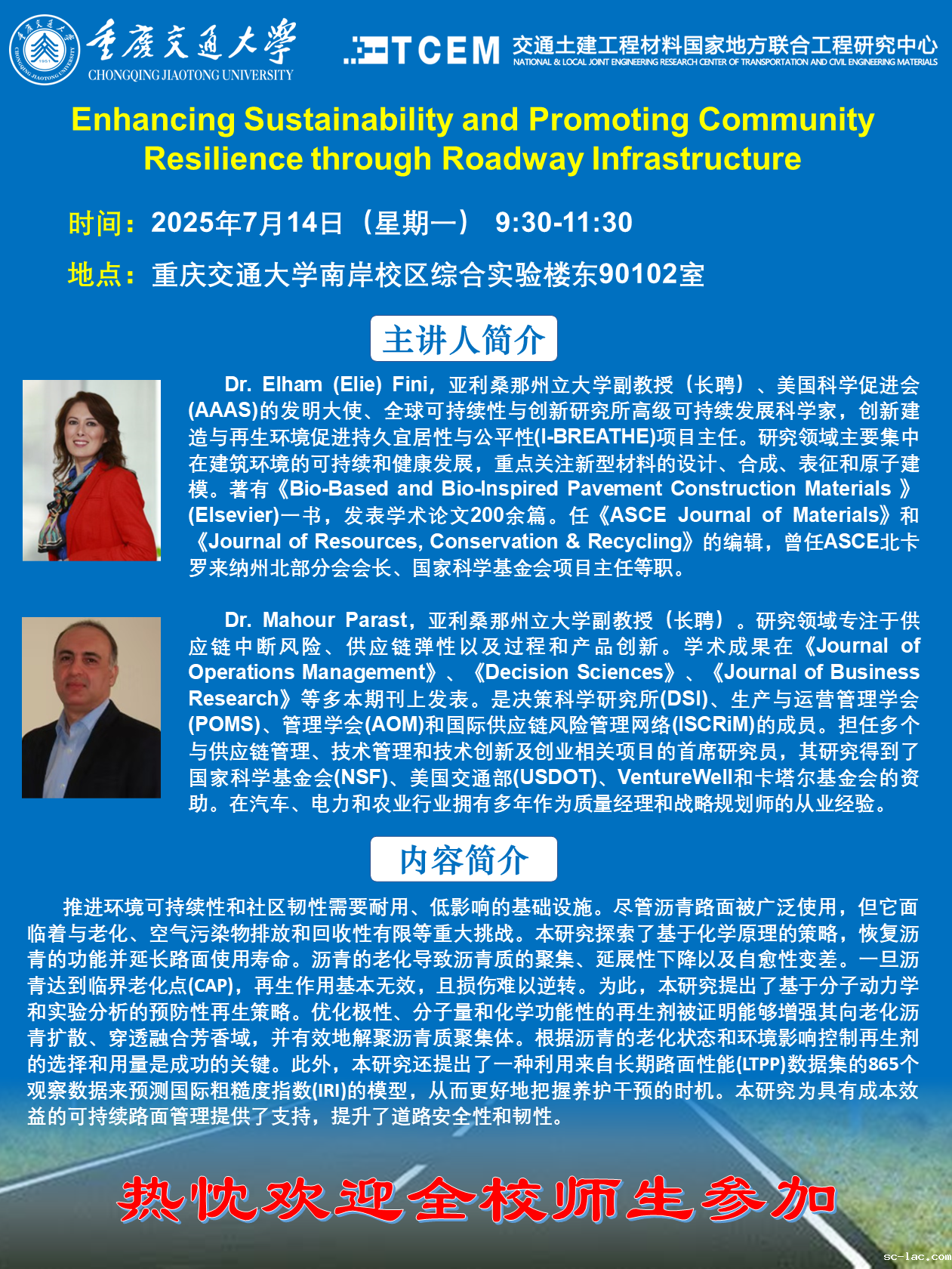 学术讲座:Enhancing Sustainability and Promoting Community Resilience through Roadway Infrastructure