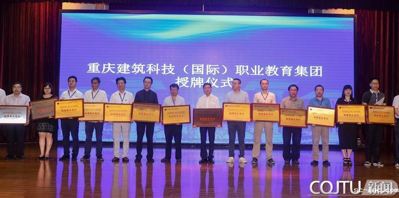 住建部刘敬疆处长、市教委罗莹副处长、新欧鹏教育集团张四平副总裁在集团成立大会上为重庆建筑科技(国际)职业教育集团揭牌并为理事长、副理事长、秘书长单位授牌。